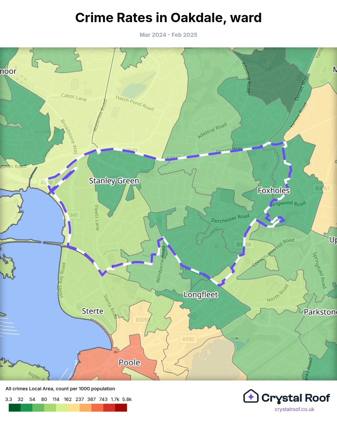 Oakdale (ward) is located within Bournemouth, Christchurch and Poole (borough). Annual total crime rate in Bournemouth, Christchurch and Poole (borough) is 89.8 crimes per thousand resident population, which can be rated as 4 out of 10 or low crime level compared to other local authority districts in England and Wales.