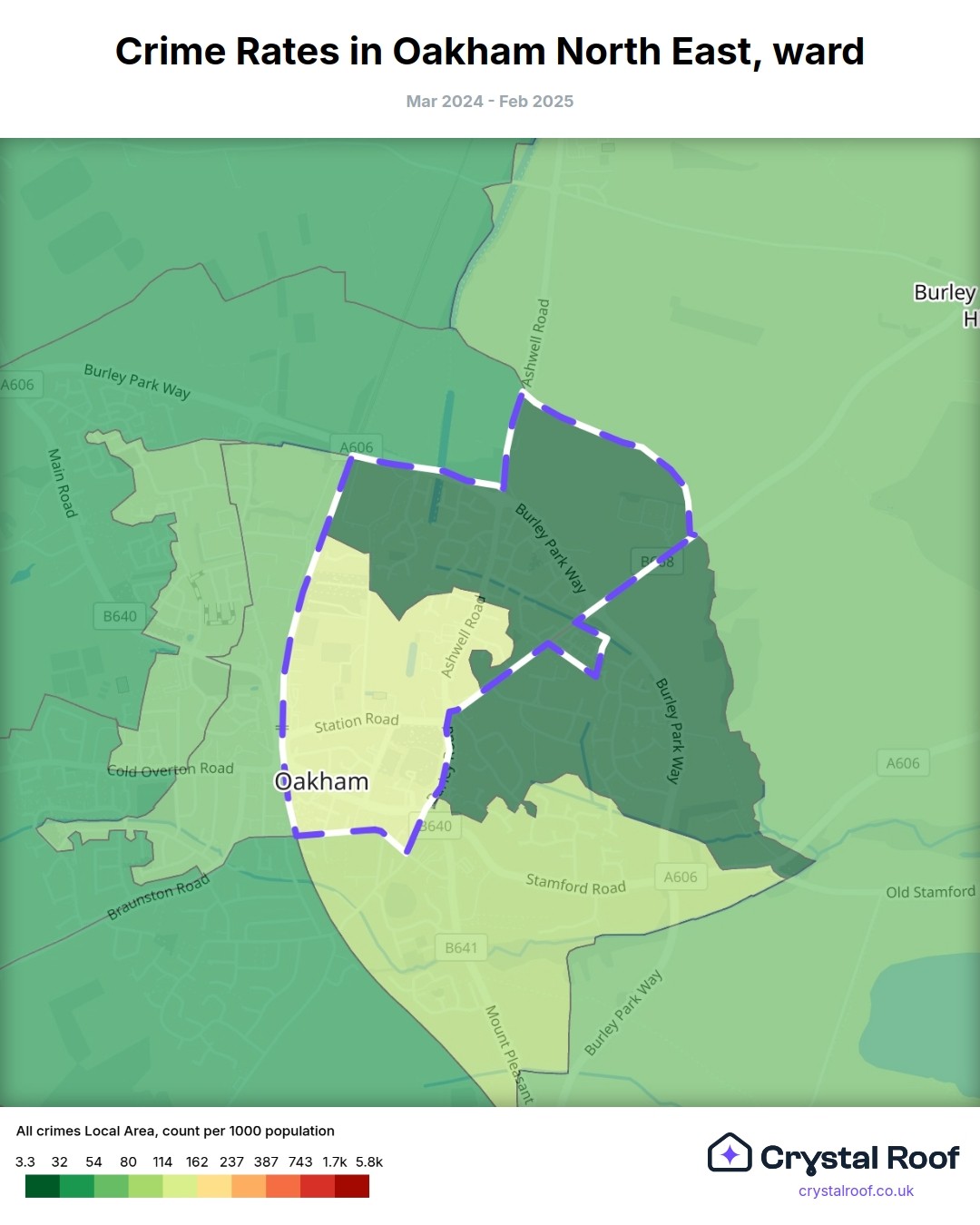 Oakham North East, (ward) includes areas with the following crime ratings (see map):