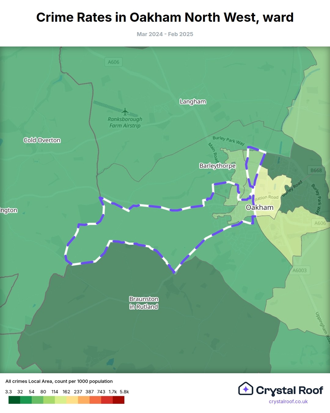 Oakham North West, (ward) includes areas with the following crime ratings (see map):