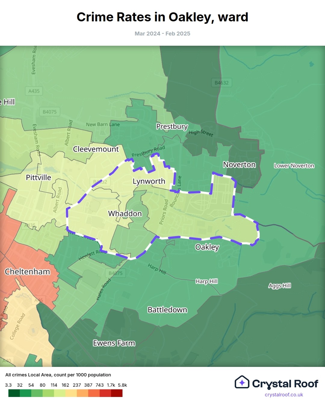 Oakley (ward) is located within Cheltenham (borough). Annual total crime rate in Cheltenham (borough) is 107 crimes per thousand resident population, which can be rated as 5 out of 10 or medium crime level compared to other local authority districts in England and Wales.