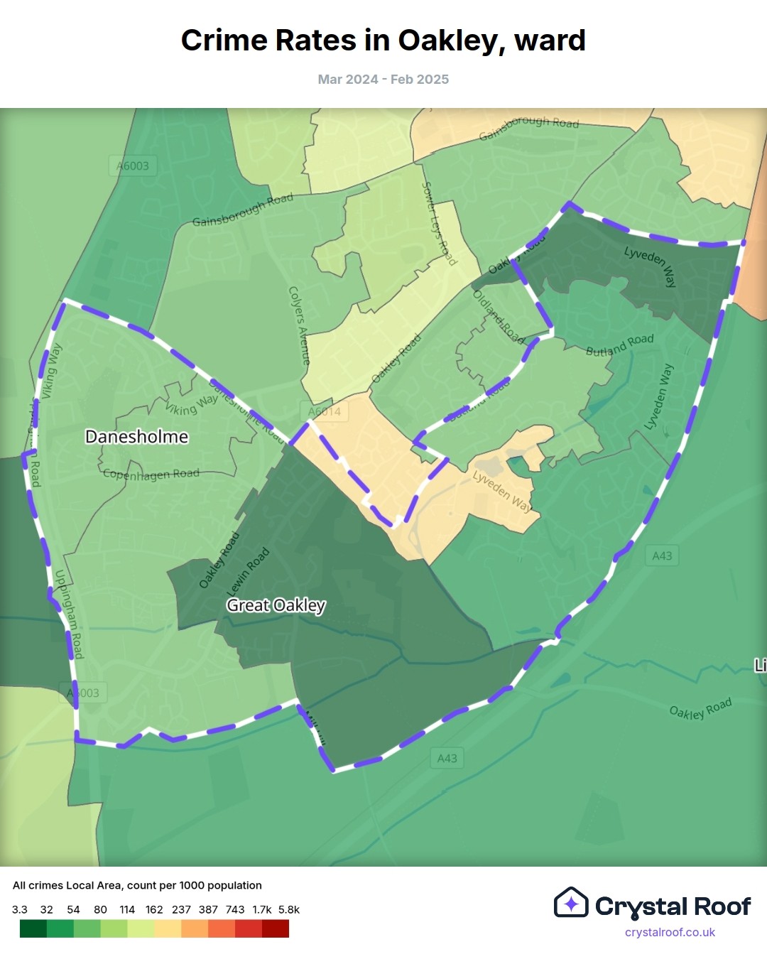 Oakley (ward) is located within North Northamptonshire (borough). Annual total crime rate in North Northamptonshire (borough) is 95 crimes per thousand resident population, which can be rated as 4 out of 10 or low crime level compared to other local authority districts in England and Wales.