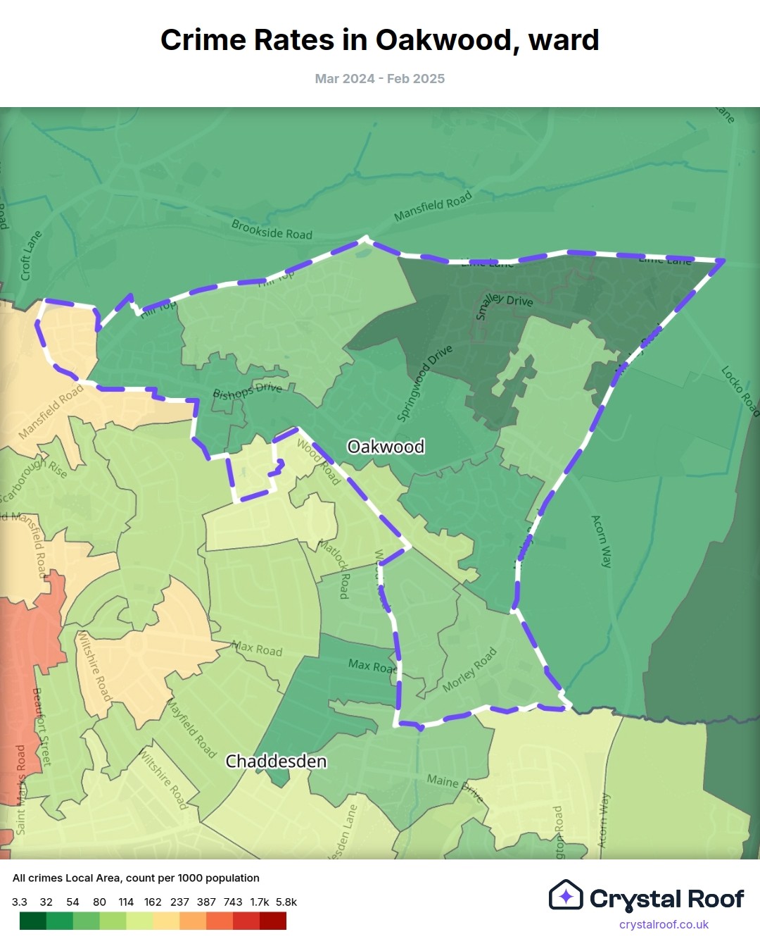 Oakwood (ward) is located within Derby (borough). Annual total crime rate in Derby (borough) is 136 crimes per thousand resident population, which can be rated as 7 out of 10 or high crime level compared to other local authority districts in England and Wales.
