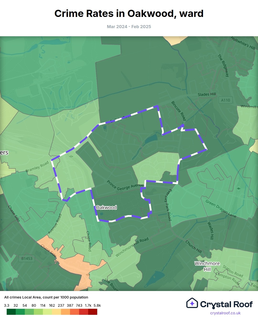 Oakwood (ward) is located within Enfield (borough). Annual total crime rate in Enfield (borough) is 113 crimes per thousand resident population, which can be rated as 5 out of 10 or medium crime level compared to other local authority districts in England and Wales.