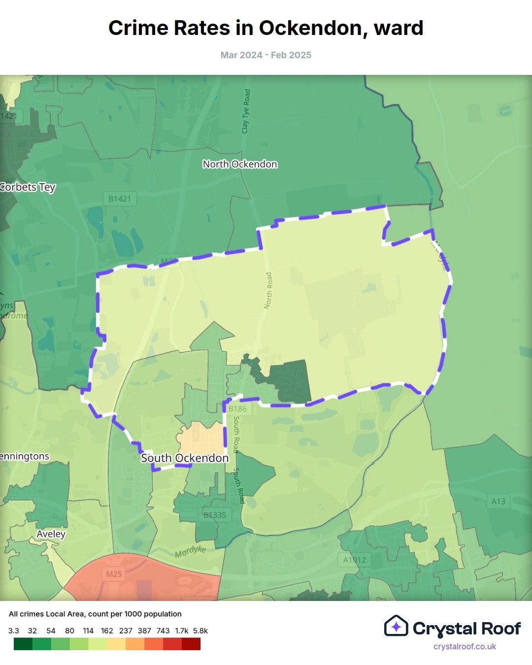 Ockendon, (ward) includes areas with the following crime ratings (see map):
