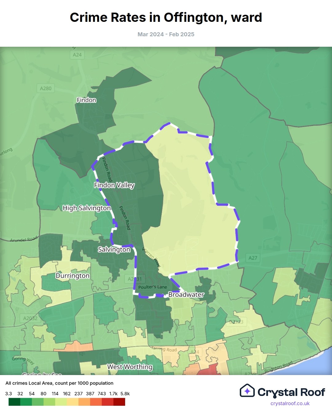 Offington (ward) is located within Worthing (borough). Annual total crime rate in Worthing (borough) is 88.9 crimes per thousand resident population, which can be rated as 4 out of 10 or low crime level compared to other local authority districts in England and Wales.