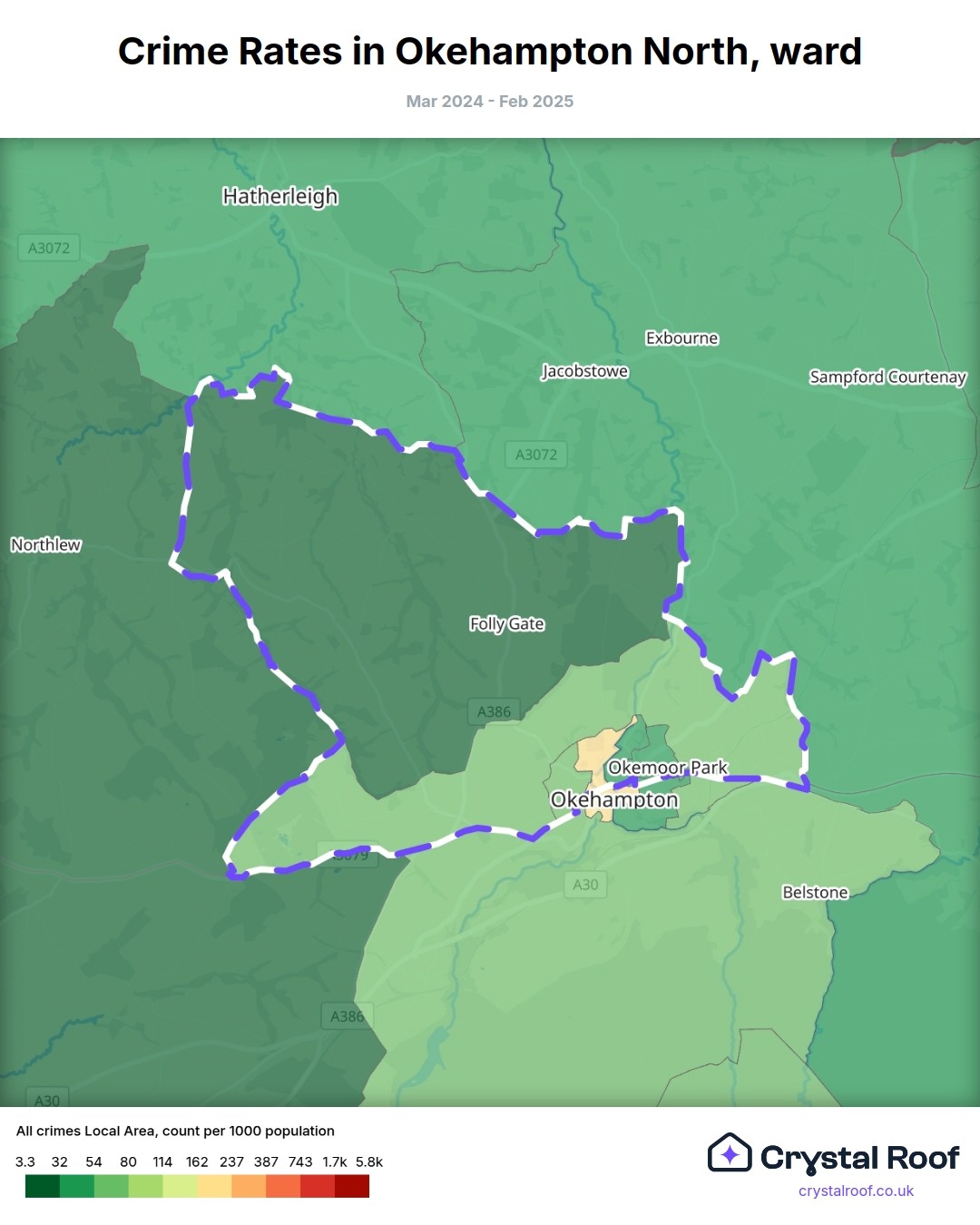 Okehampton North, (ward) includes areas with the following crime ratings (see map):