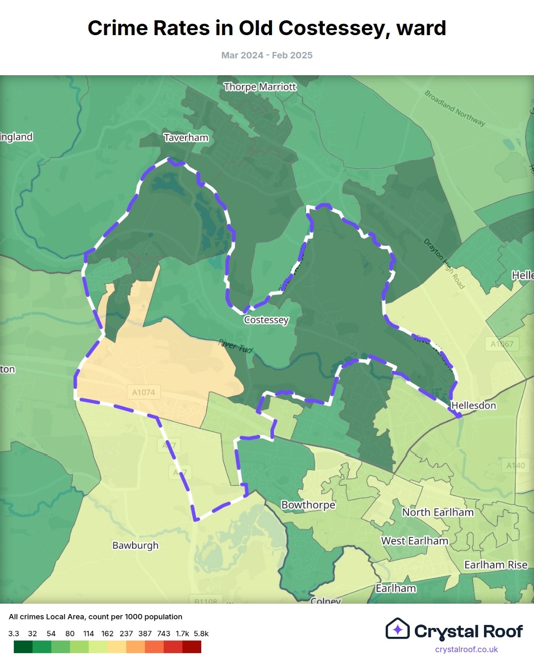 Old Costessey, (ward) includes areas with the following crime ratings (see map):