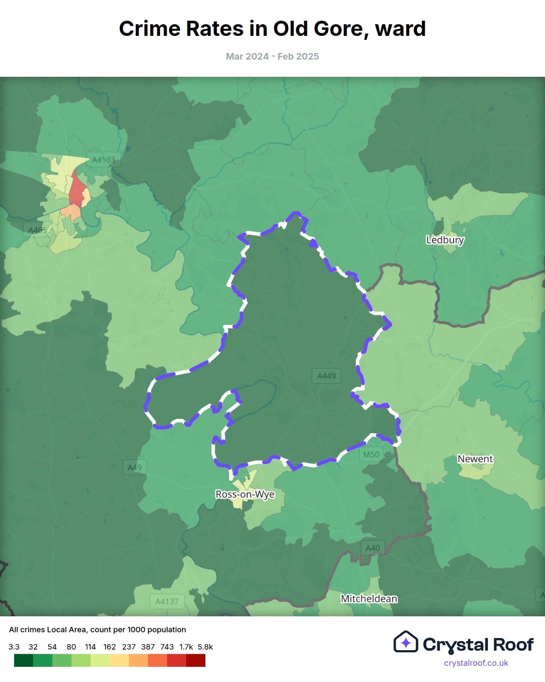 Old Gore (ward) is located within Herefordshire, County of (borough). Annual total crime rate in Herefordshire, County of (borough) is 63.5 crimes per thousand resident population, which can be rated as 2 out of 10 or low crime level compared to other local authority districts in England and Wales.