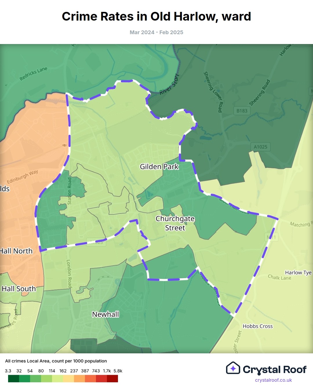 Old Harlow, (ward) includes areas with the following crime ratings (see map):