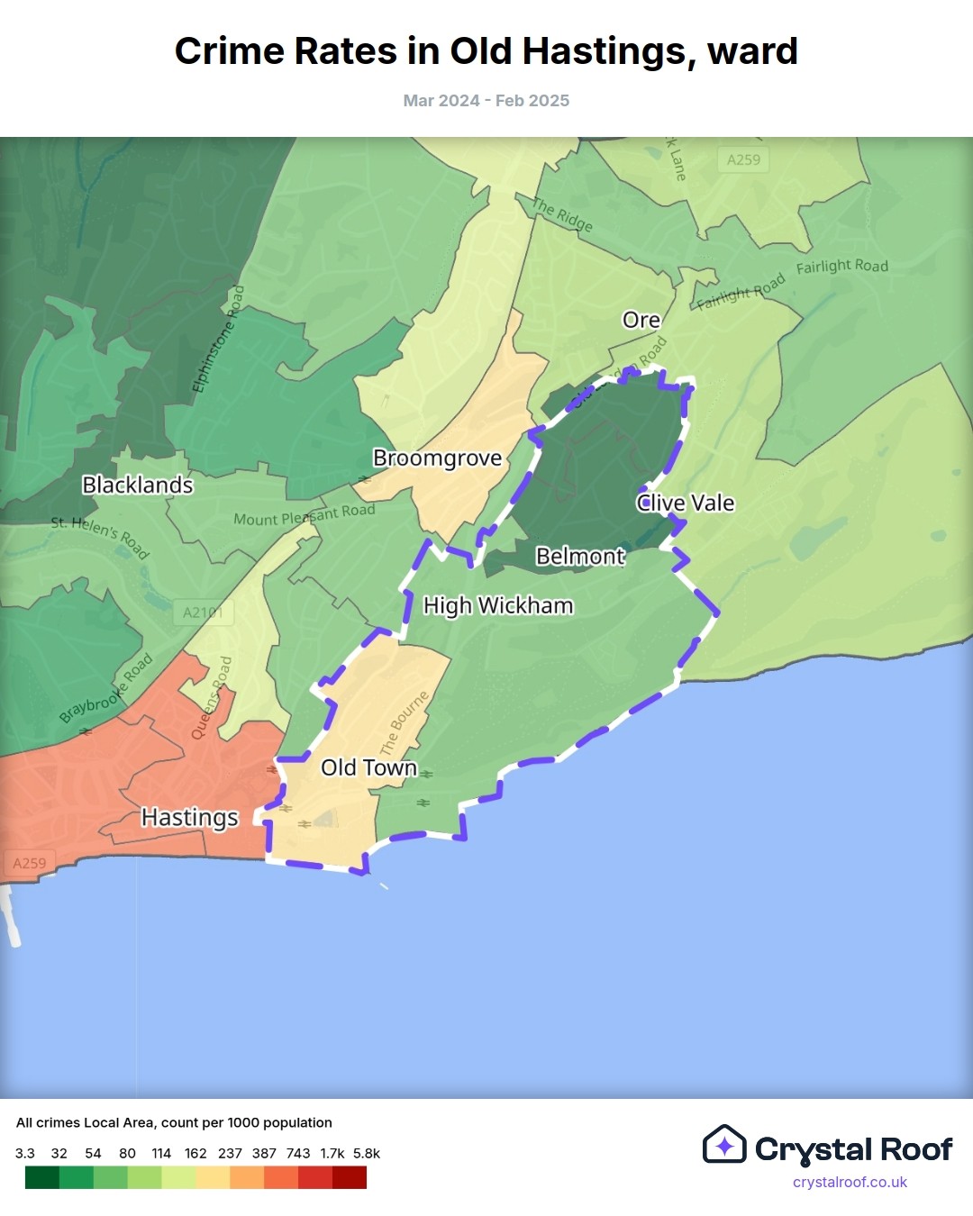 Old Hastings, (ward) includes areas with the following crime ratings (see map):