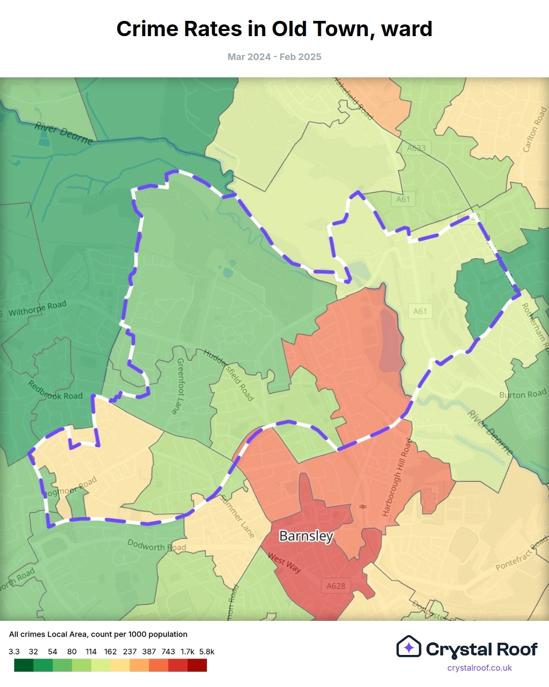 Old Town (ward) is located within Barnsley (borough). Annual total crime rate in Barnsley (borough) is 113 crimes per thousand resident population, which can be rated as 5 out of 10 or medium crime level compared to other local authority districts in England and Wales.