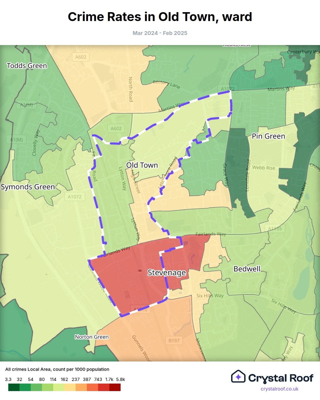 Old Town (ward) is located within Stevenage (borough). Annual total crime rate in Stevenage (borough) is 111 crimes per thousand resident population, which can be rated as 5 out of 10 or medium crime level compared to other local authority districts in England and Wales.