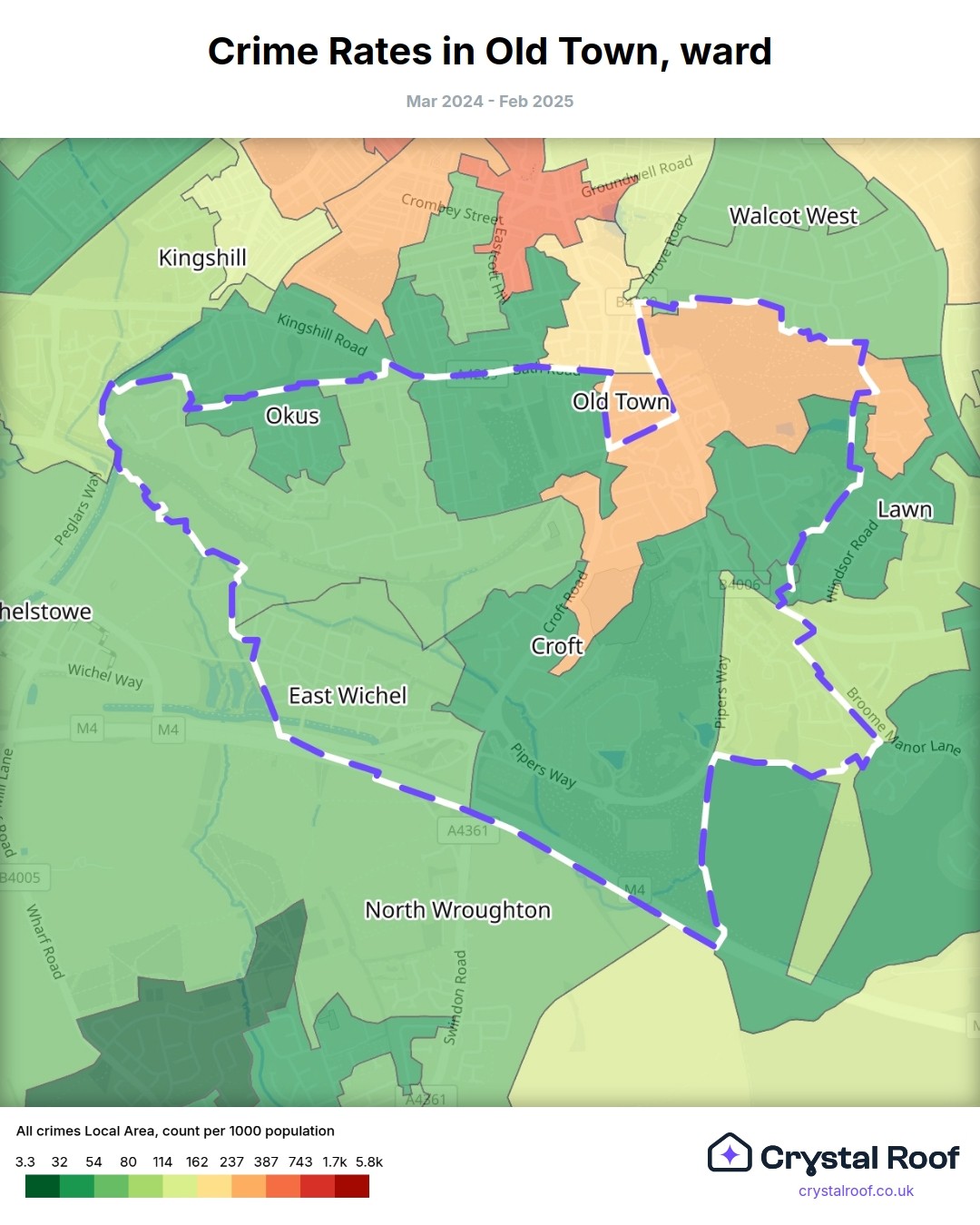 Old Town (ward) is located within Swindon (borough). Annual total crime rate in Swindon (borough) is 86.5 crimes per thousand resident population, which can be rated as 4 out of 10 or low crime level compared to other local authority districts in England and Wales.