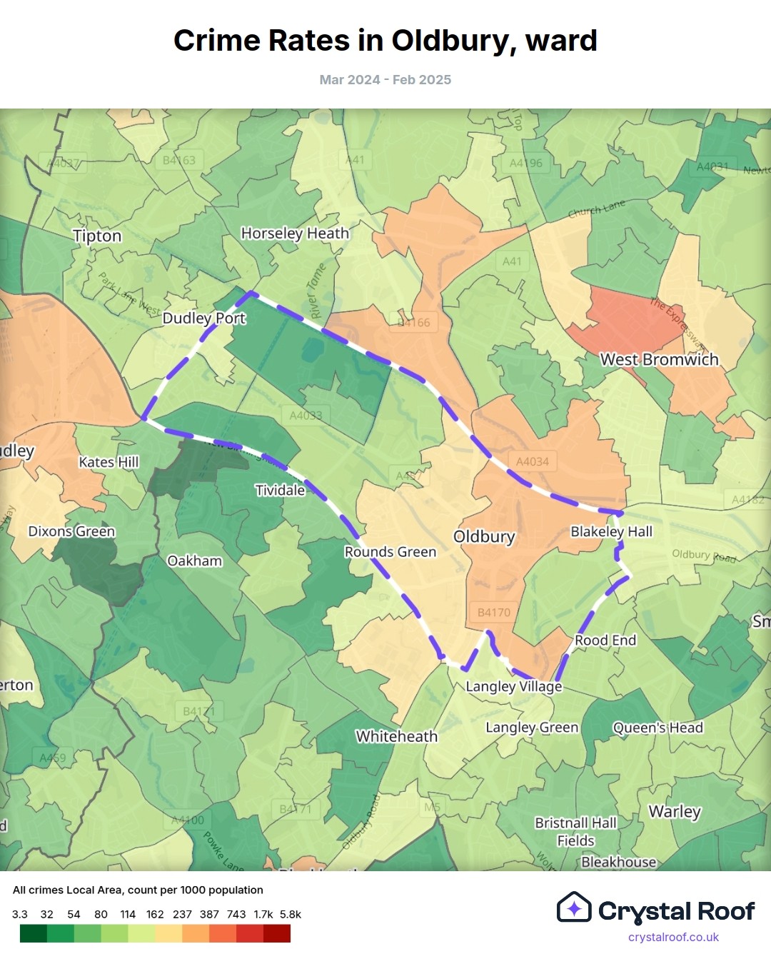 The figures in grey indicate the relative ratings of Oldbury (ward) for a specific crime type compared to other wards in England and Wales.