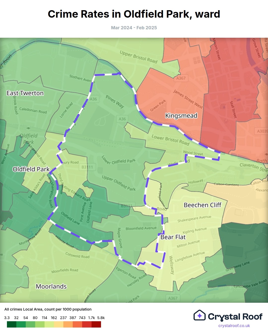 Oldfield Park, (ward) includes areas with the following crime ratings (see map):