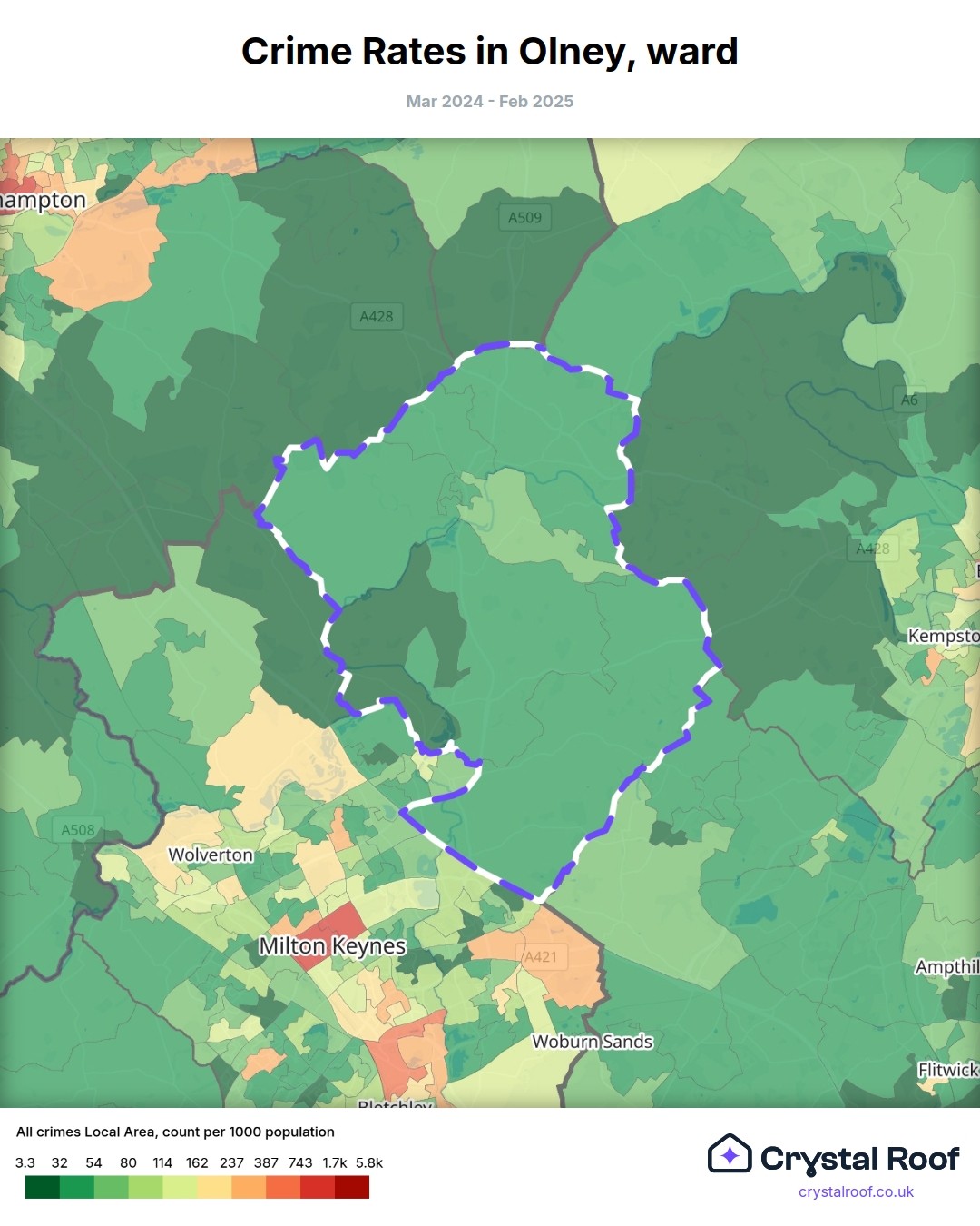 Olney (ward) is located within Milton Keynes (borough). Annual total crime rate in Milton Keynes (borough) is 107 crimes per thousand resident population, which can be rated as 5 out of 10 or medium crime level compared to other local authority districts in England and Wales.