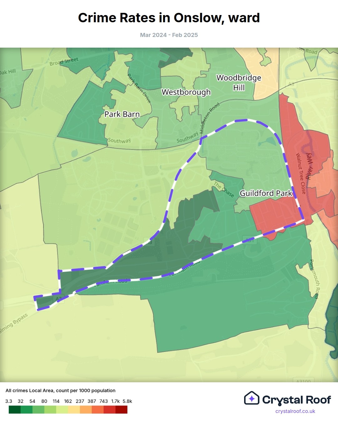 Onslow (ward) is located within Guildford (borough). Annual total crime rate in Guildford (borough) is 89.5 crimes per thousand resident population, which can be rated as 4 out of 10 or low crime level compared to other local authority districts in England and Wales.