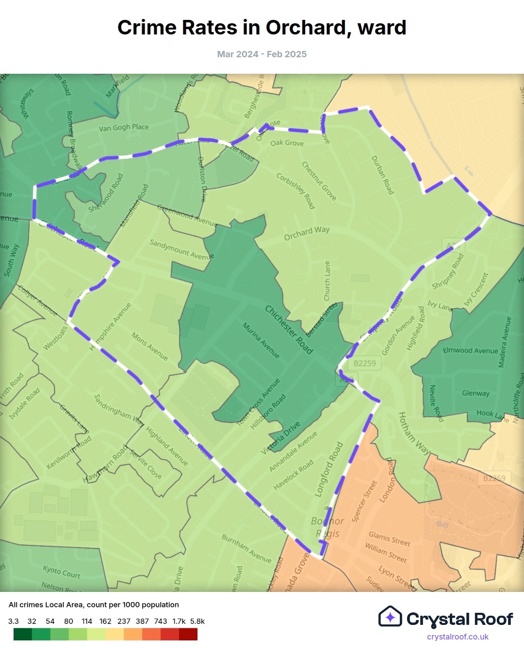 Orchard, (ward) includes areas with the following crime ratings (see map):