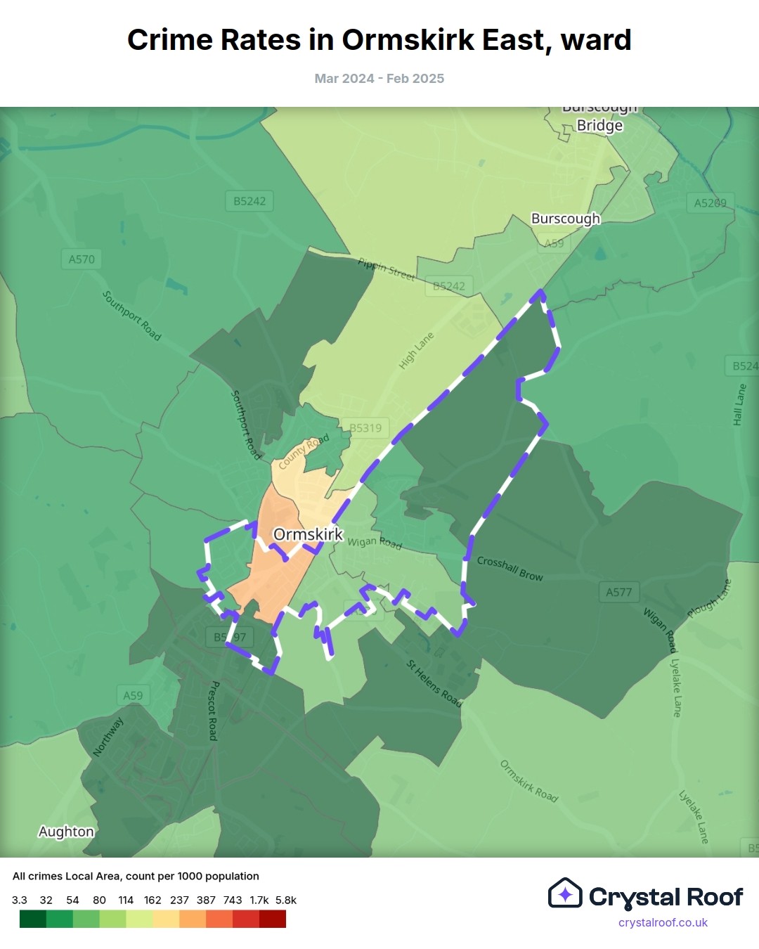 Ormskirk East, (ward) includes areas with the following crime ratings (see map):