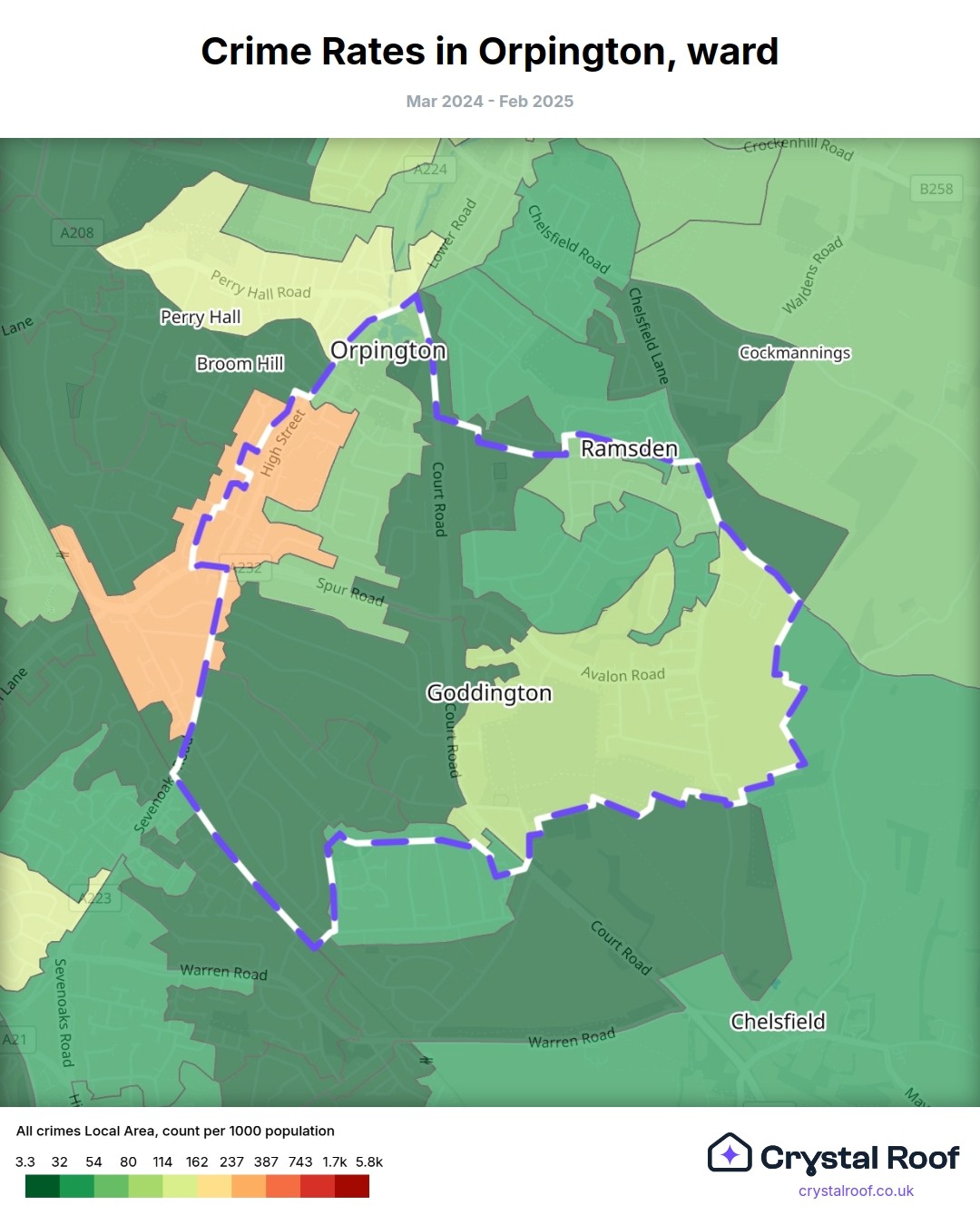 Orpington, (ward) includes areas with the following crime ratings (see map):