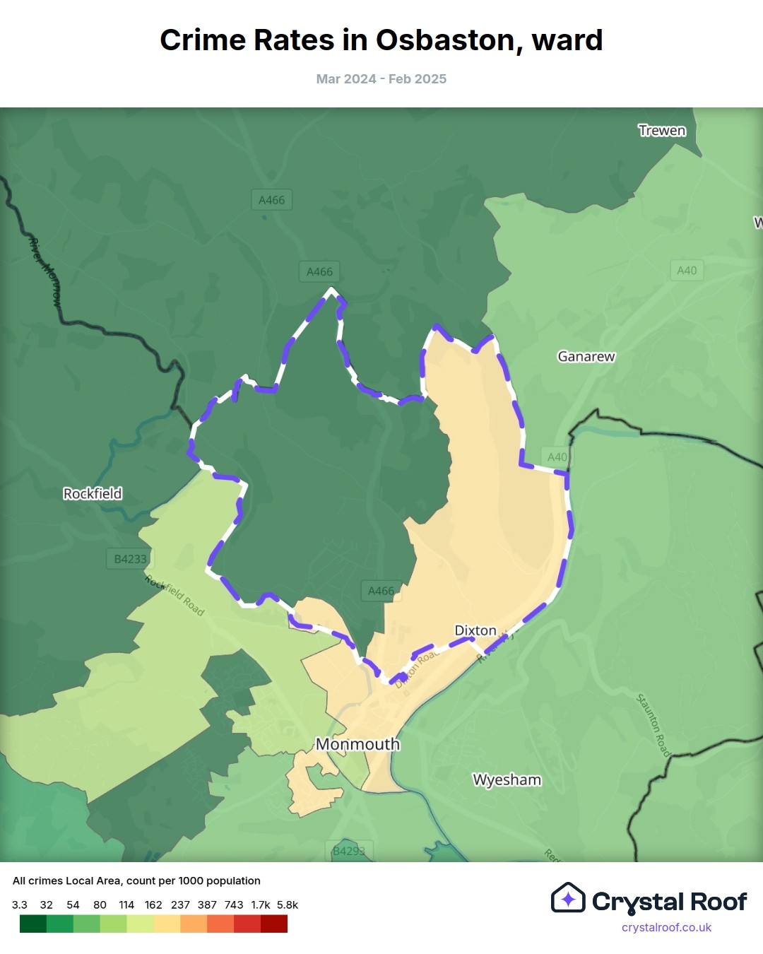 Osbaston (ward) is located within Monmouthshire (borough). Annual total crime rate in Monmouthshire (borough) is 66 crimes per thousand resident population, which can be rated as 2 out of 10 or low crime level compared to other local authority districts in England and Wales.