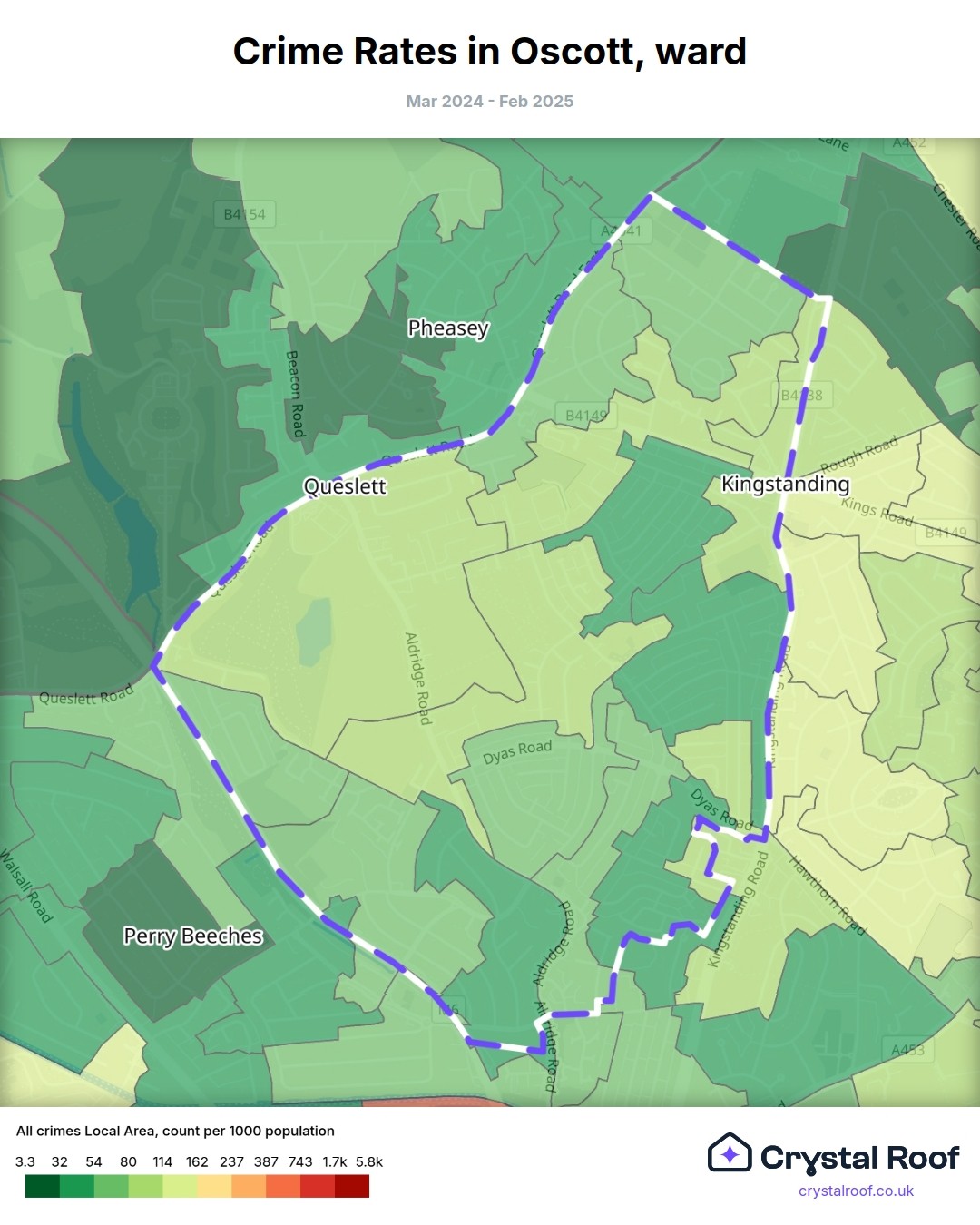 Oscott, (ward) includes areas with the following crime ratings (see map):