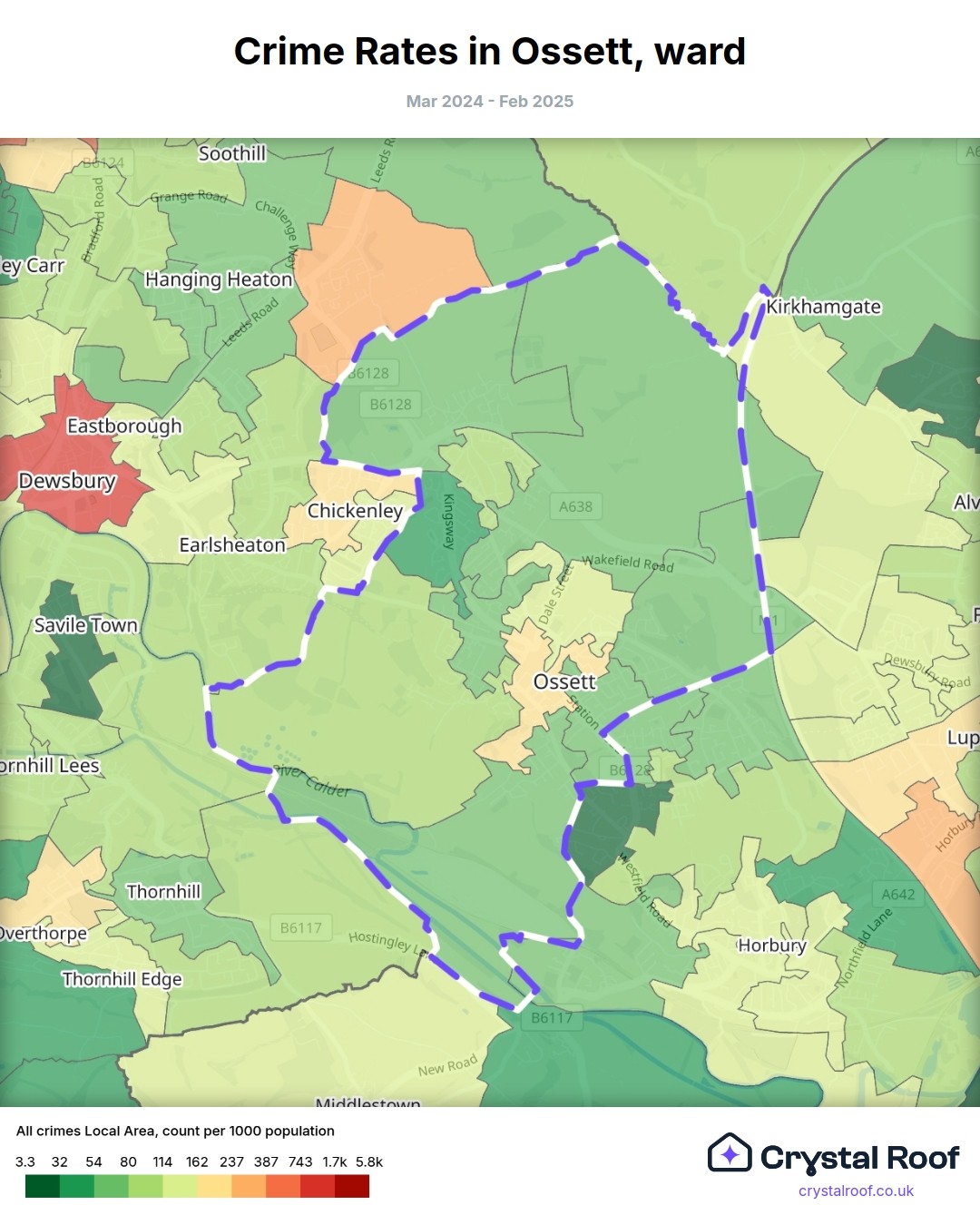 The figures in grey indicate the relative ratings of Ossett (ward) for a specific crime type compared to other wards in England and Wales.