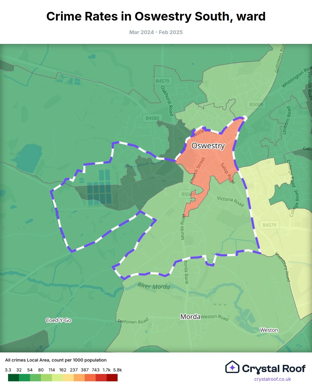 The figures in grey indicate the relative ratings of Oswestry South (ward) for a specific crime type compared to other wards in England and Wales.
