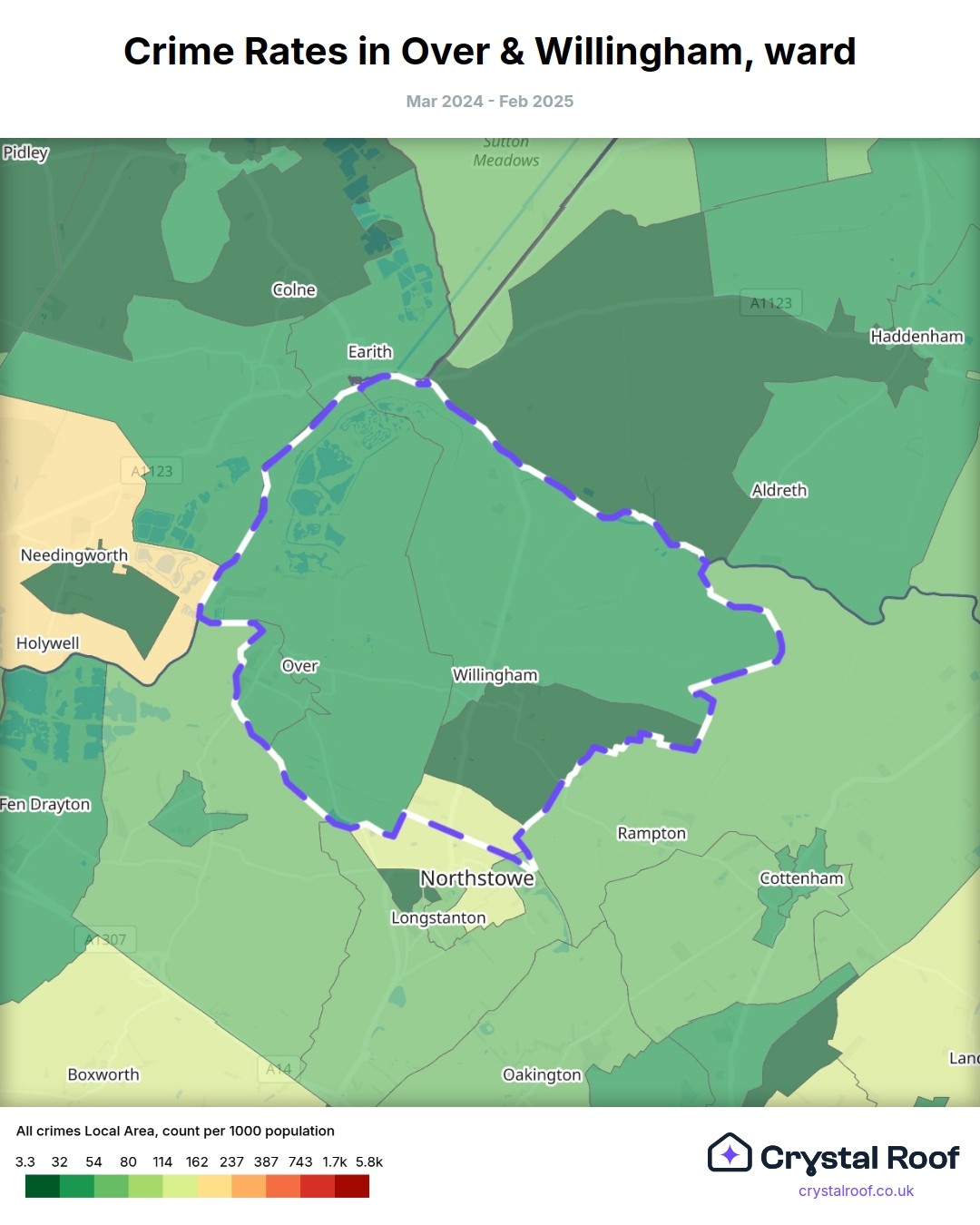 The figures in grey indicate the relative ratings of Over & Willingham (ward) for a specific crime type compared to other wards in England and Wales.
