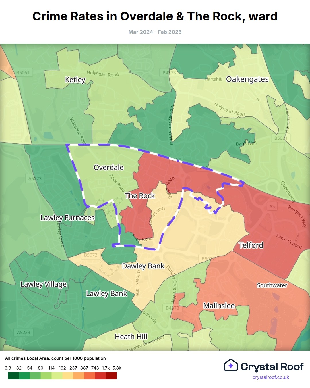 The figures in grey indicate the relative ratings of Overdale & The Rock (ward) for a specific crime type compared to other wards in England and Wales.