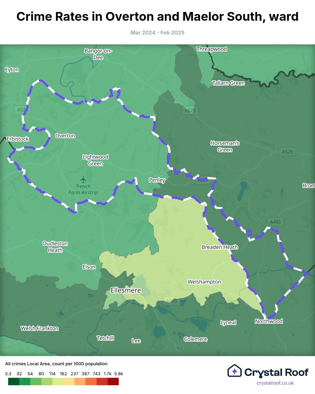 Overton and Maelor South, (ward) includes areas with the following crime ratings (see map):