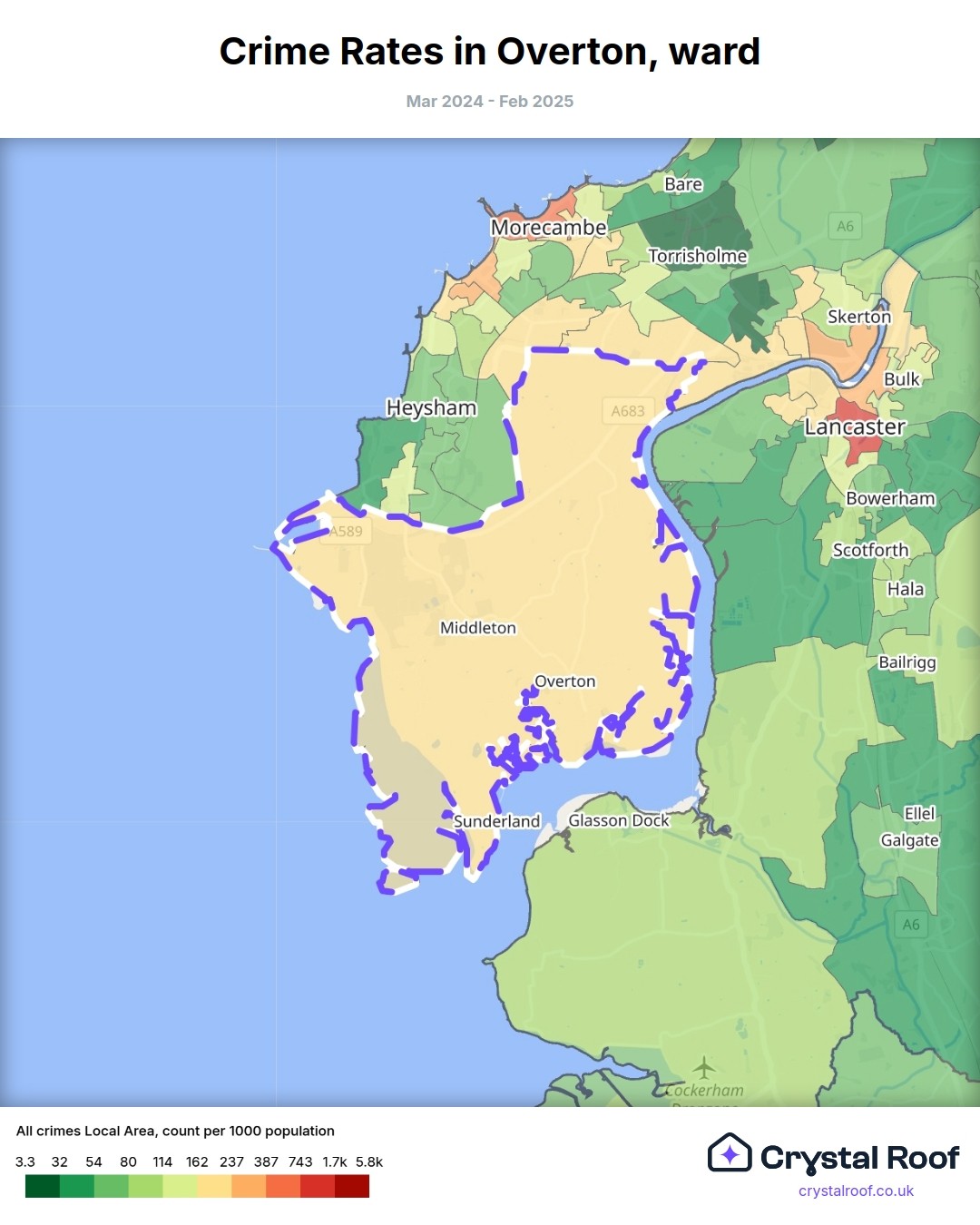 Overton (ward) is located within Lancaster (borough). Annual total crime rate in Lancaster (borough) is 109 crimes per thousand resident population, which can be rated as 5 out of 10 or medium crime level compared to other local authority districts in England and Wales.