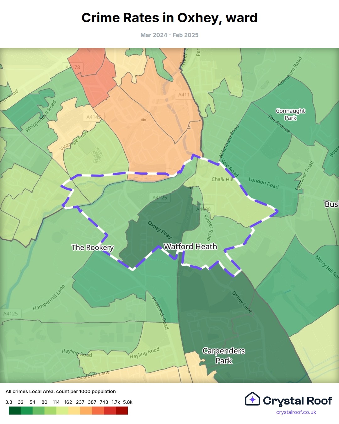 Oxhey, (ward) includes areas with the following crime ratings (see map):