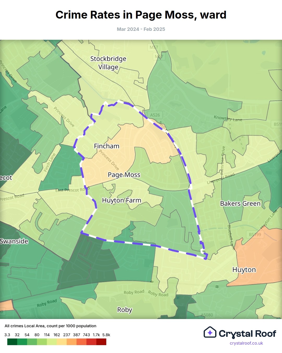 Page Moss, (ward) includes areas with the following crime ratings (see map):