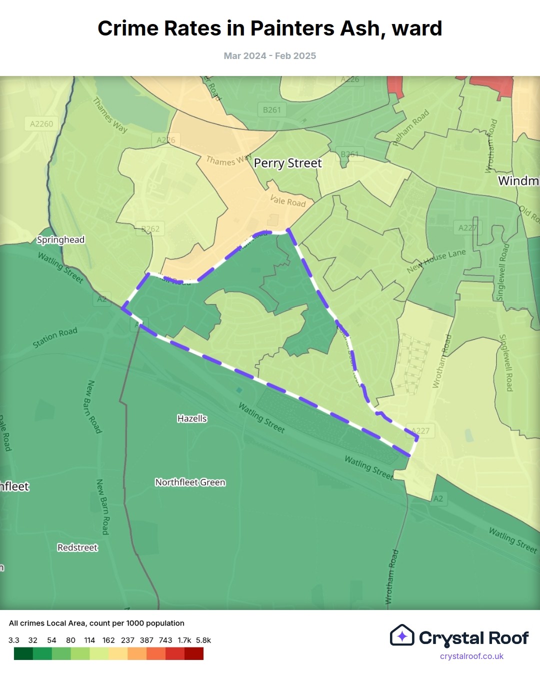 Painters Ash (ward) is located within Gravesham (borough). Annual total crime rate in Gravesham (borough) is 106 crimes per thousand resident population, which can be rated as 5 out of 10 or medium crime level compared to other local authority districts in England and Wales.