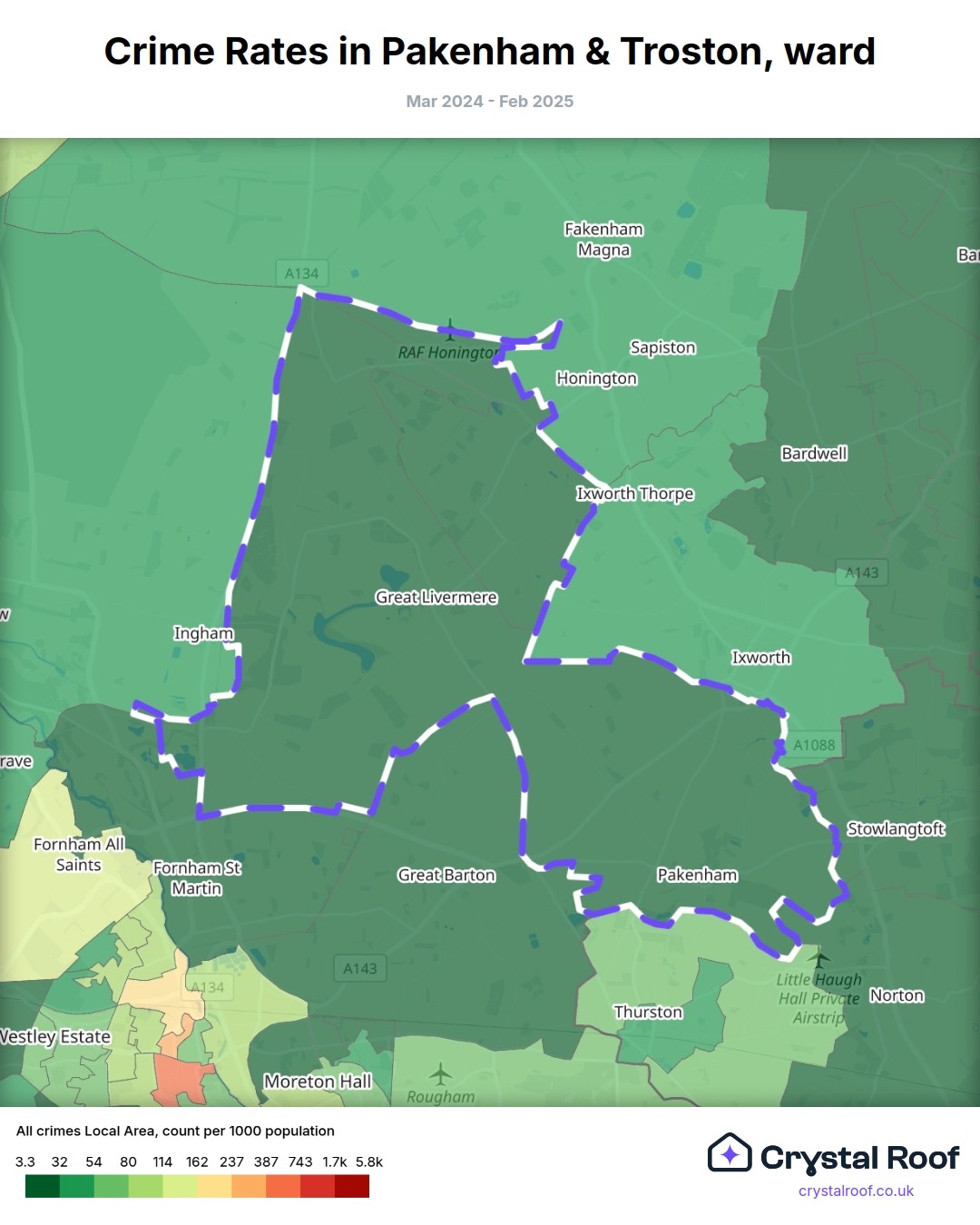 Pakenham & Troston, (ward) includes areas with the following crime ratings (see map):