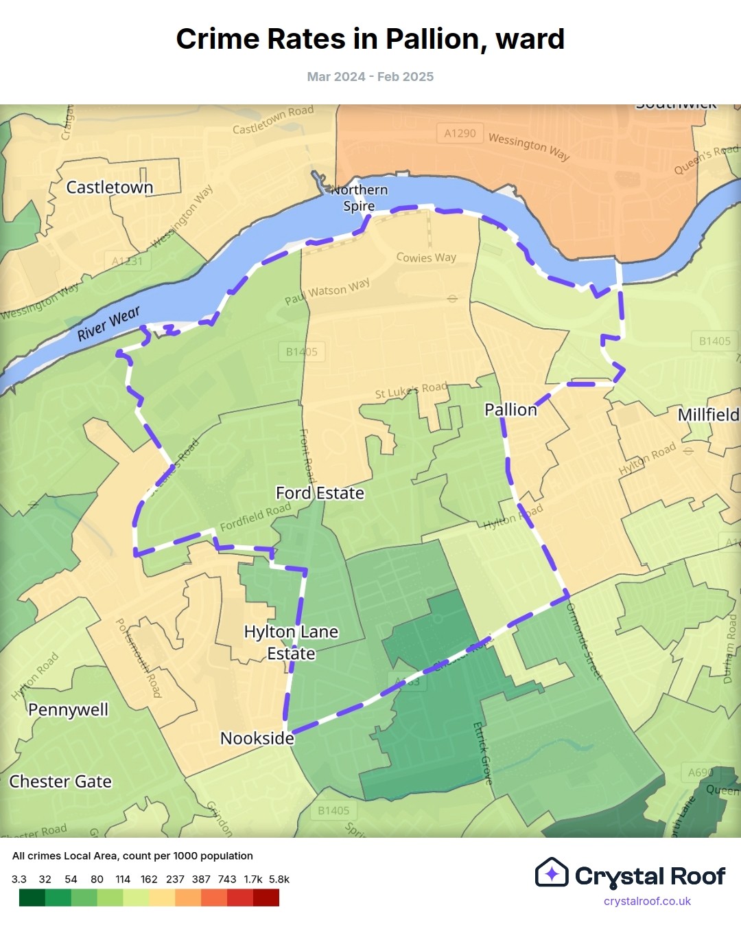 Pallion, (ward) includes areas with the following crime ratings (see map):