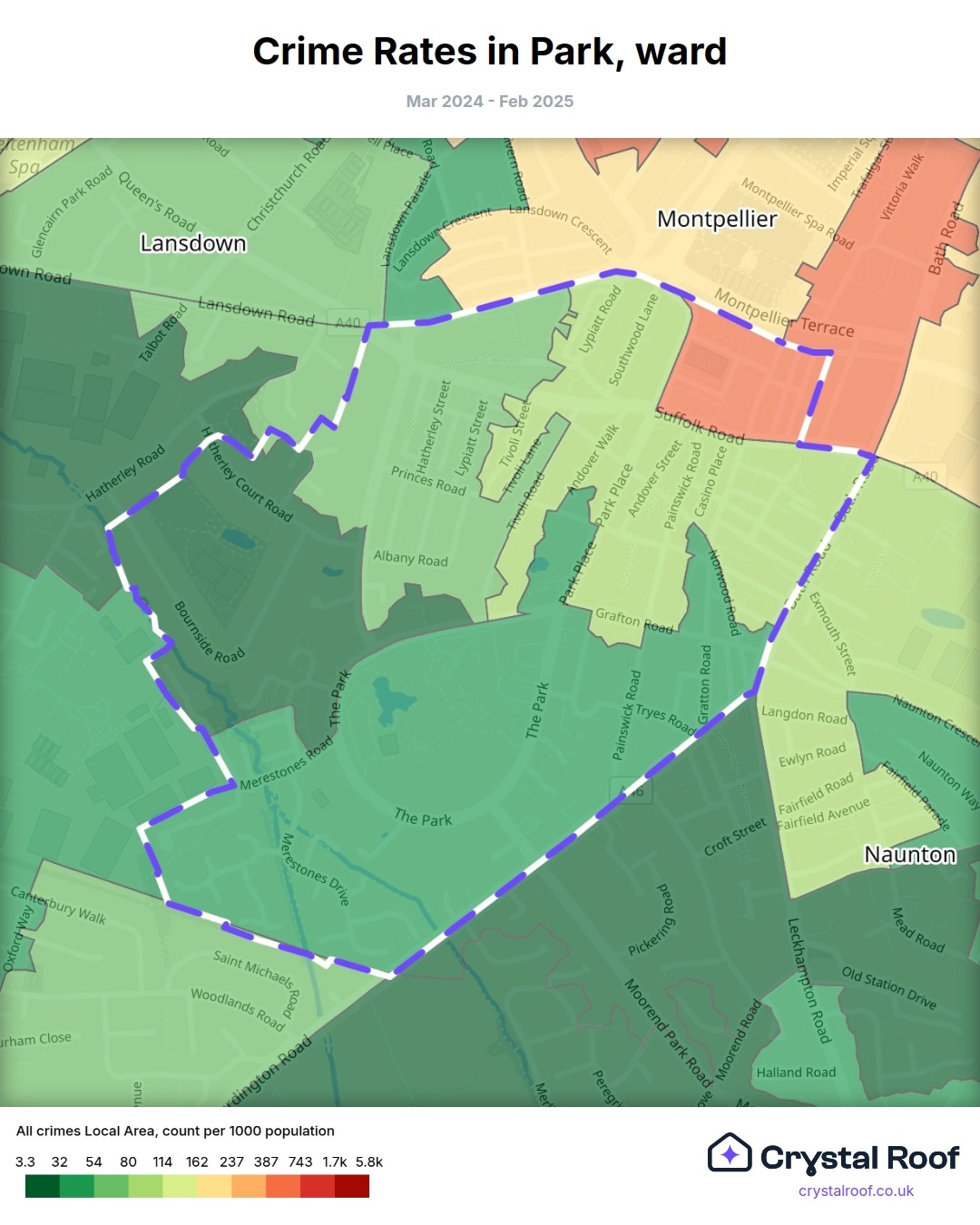Park (ward) is located within Cheltenham (borough). Annual total crime rate in Cheltenham (borough) is 107 crimes per thousand resident population, which can be rated as 5 out of 10 or medium crime level compared to other local authority districts in England and Wales.