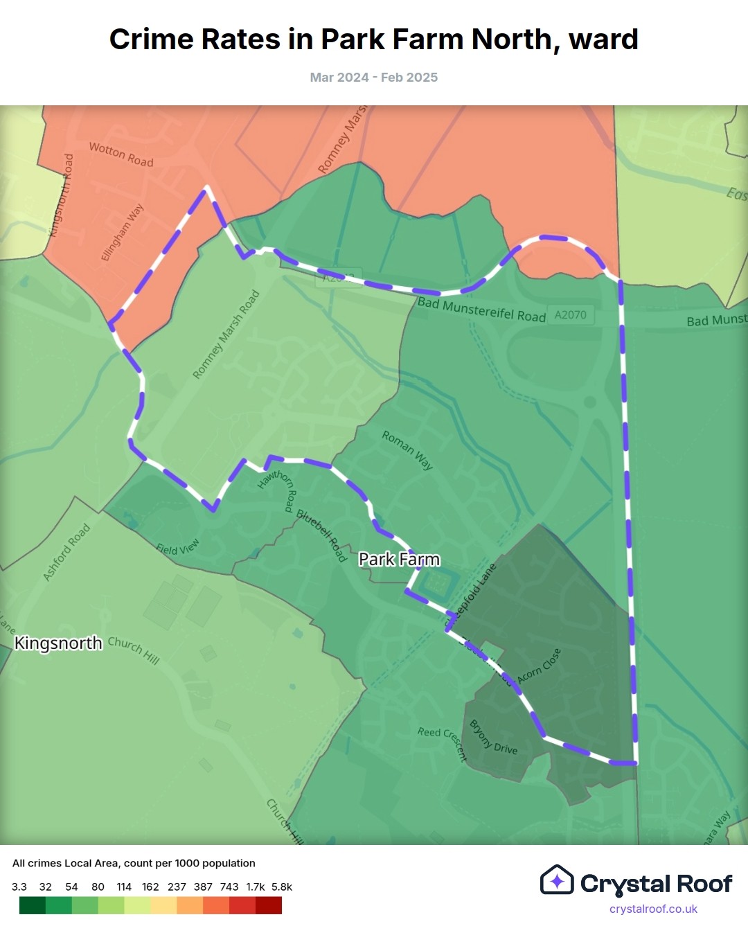 Park Farm North (ward) is located within Ashford (borough). Annual total crime rate in Ashford (borough) is 82.8 crimes per thousand resident population, which can be rated as 3 out of 10 or low crime level compared to other local authority districts in England and Wales.