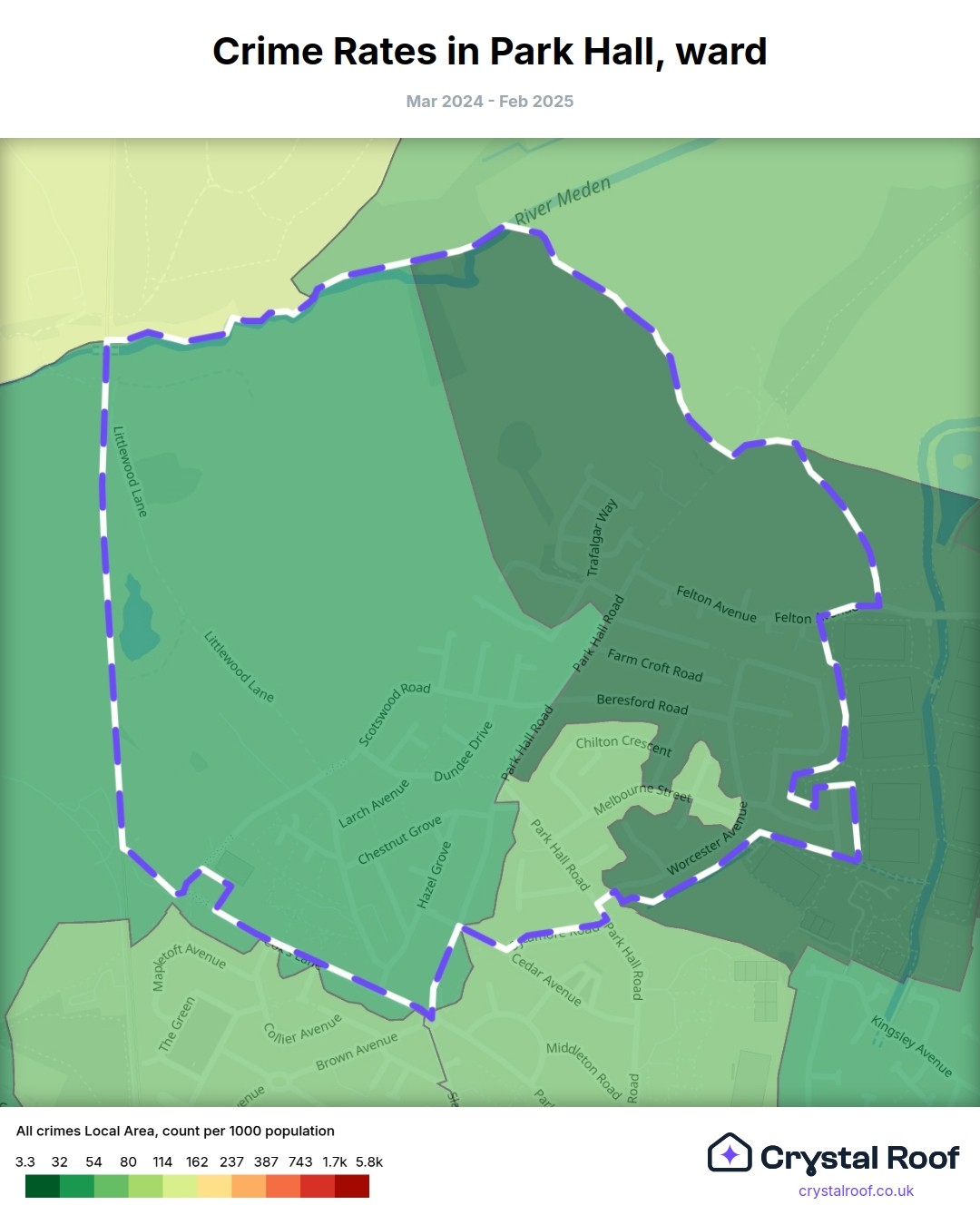 Park Hall, (ward) includes areas with the following crime ratings (see map):