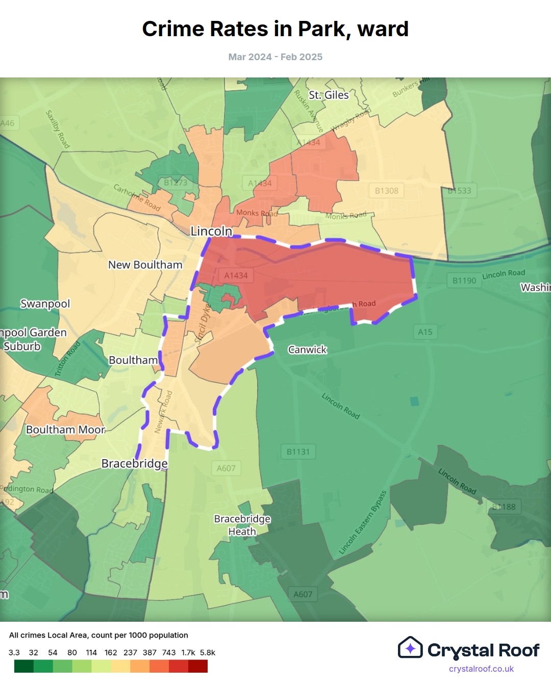 Park (ward) is located within Lincoln (borough). Annual total crime rate in Lincoln (borough) is 158 crimes per thousand resident population, which can be rated as 7 out of 10 or high crime level compared to other local authority districts in England and Wales.