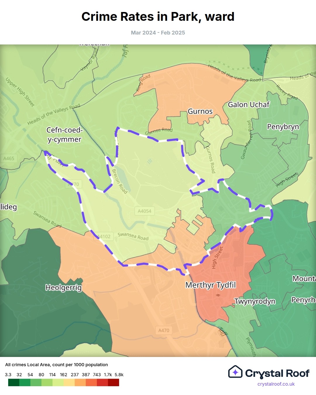 Park (ward) is located within Merthyr Tydfil (borough). Annual total crime rate in Merthyr Tydfil (borough) is 111 crimes per thousand resident population, which can be rated as 5 out of 10 or medium crime level compared to other local authority districts in England and Wales.