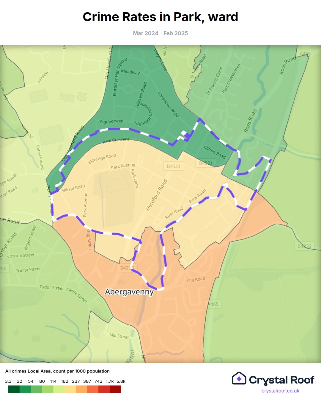 Park (ward) is located within Monmouthshire (borough). Annual total crime rate in Monmouthshire (borough) is 66 crimes per thousand resident population, which can be rated as 2 out of 10 or low crime level compared to other local authority districts in England and Wales.