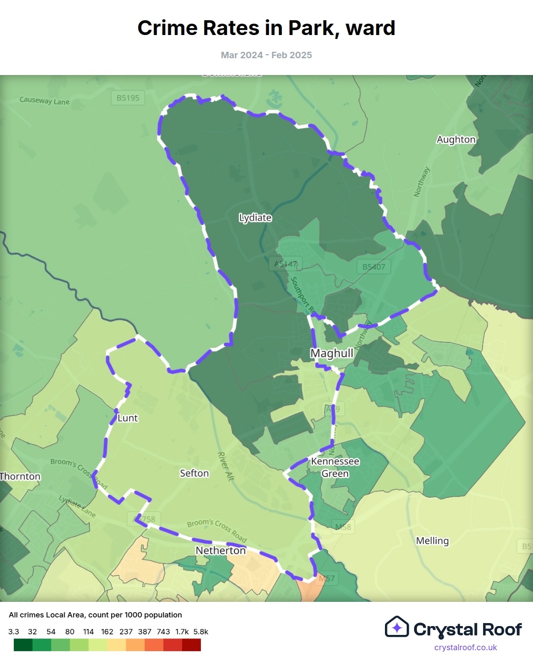 Park (ward) is located within Sefton (borough). Annual total crime rate in Sefton (borough) is 86.3 crimes per thousand resident population, which can be rated as 4 out of 10 or low crime level compared to other local authority districts in England and Wales.