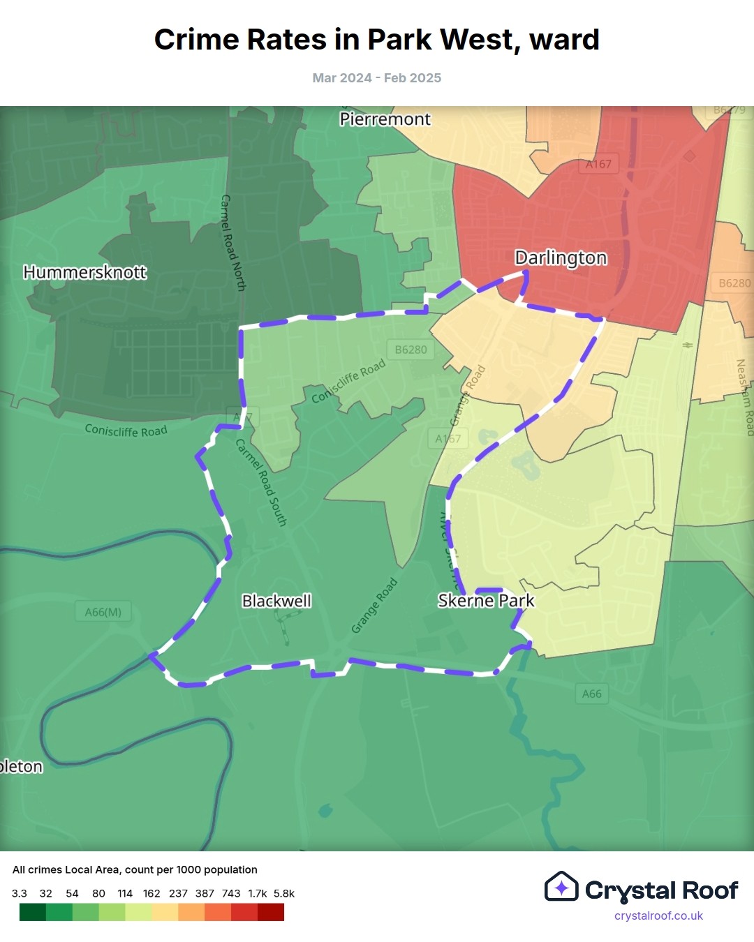 Park West (ward) is located within Darlington (borough). Annual total crime rate in Darlington (borough) is 112 crimes per thousand resident population, which can be rated as 5 out of 10 or medium crime level compared to other local authority districts in England and Wales.