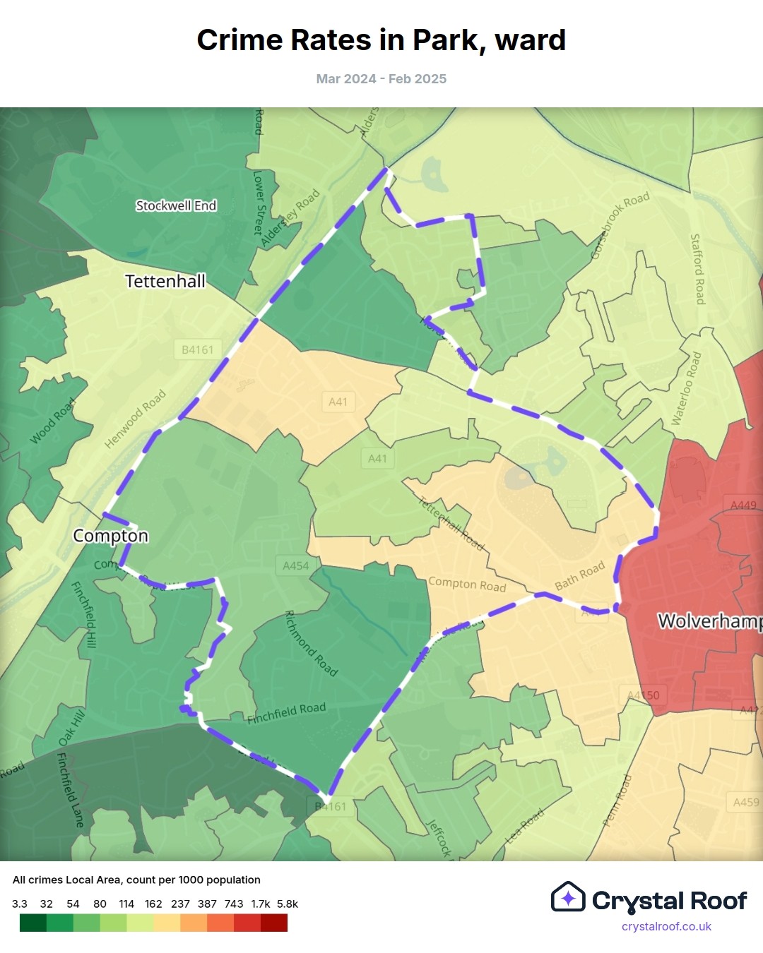 Park (ward) is located within Wolverhampton (borough). Annual total crime rate in Wolverhampton (borough) is 111 crimes per thousand resident population, which can be rated as 5 out of 10 or medium crime level compared to other local authority districts in England and Wales.
