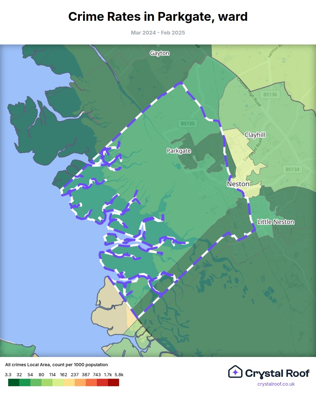 Parkgate (ward) is located within Cheshire West and Chester (borough). Annual total crime rate in Cheshire West and Chester (borough) is 69.3 crimes per thousand resident population, which can be rated as 2 out of 10 or low crime level compared to other local authority districts in England and Wales.
