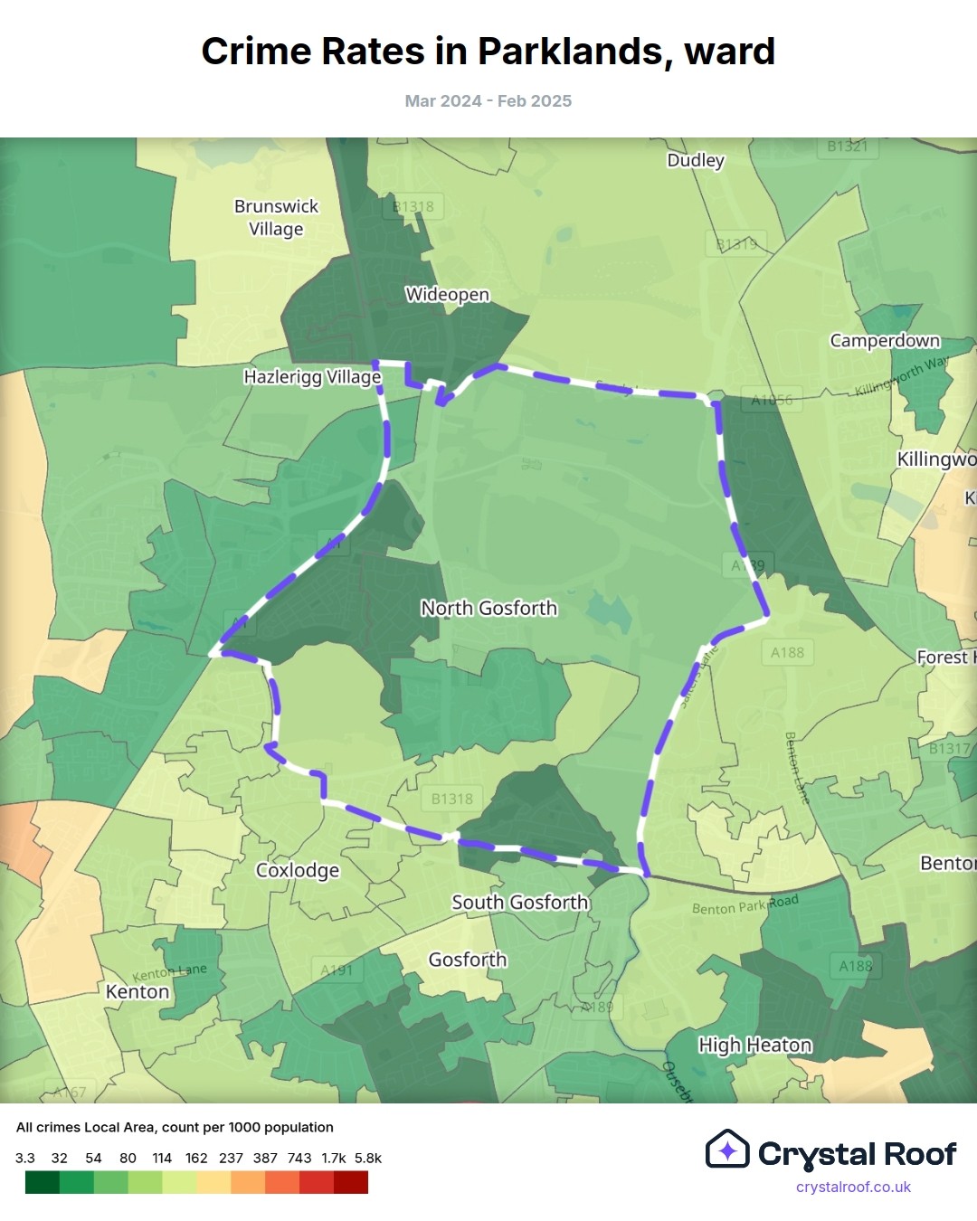 Parklands (ward) is located within Newcastle upon Tyne (borough). Annual total crime rate in Newcastle upon Tyne (borough) is 148 crimes per thousand resident population, which can be rated as 7 out of 10 or high crime level compared to other local authority districts in England and Wales.