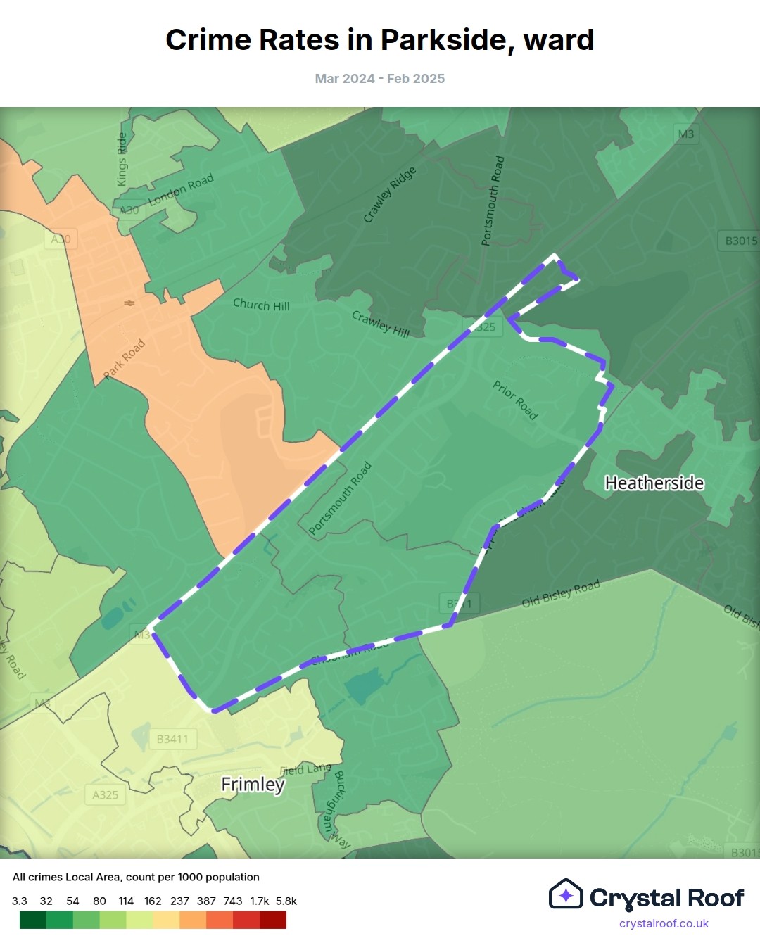 Parkside (ward) is located within Surrey Heath (borough). Annual total crime rate in Surrey Heath (borough) is 65.5 crimes per thousand resident population, which can be rated as 2 out of 10 or low crime level compared to other local authority districts in England and Wales.