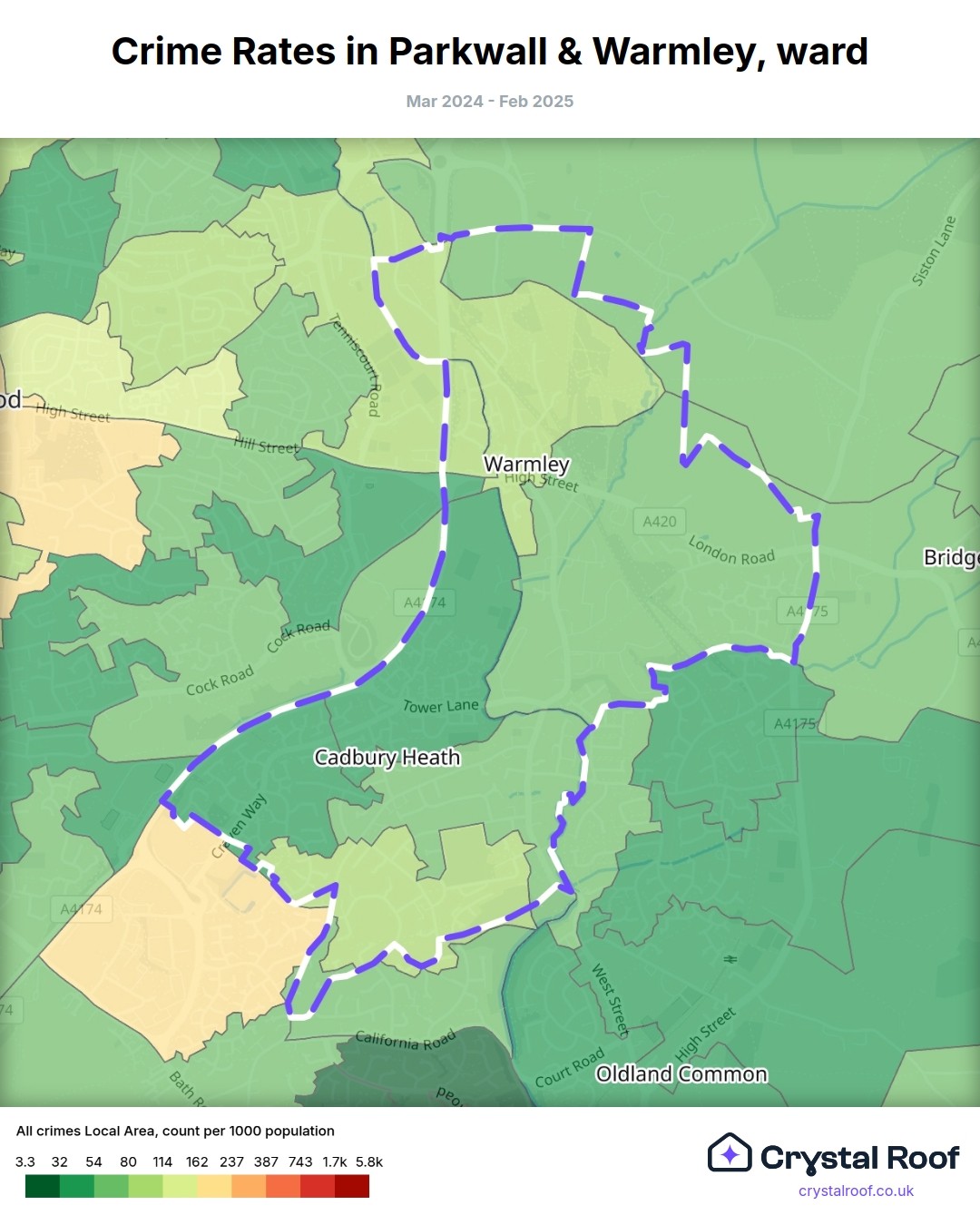 Parkwall & Warmley, (ward) includes areas with the following crime ratings (see map):